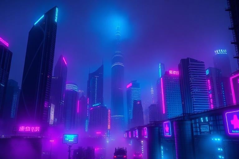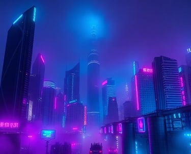 A futuristic cityscape with neon lighting and atmospheric effects, showcasing advanced modeling and lighting techniques.